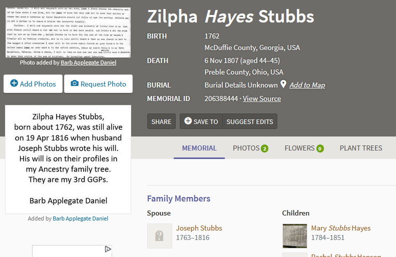 Mistake #3: Zilpha Stubbs did not die in Preble county nor is she buried in Preble County, Ohio.