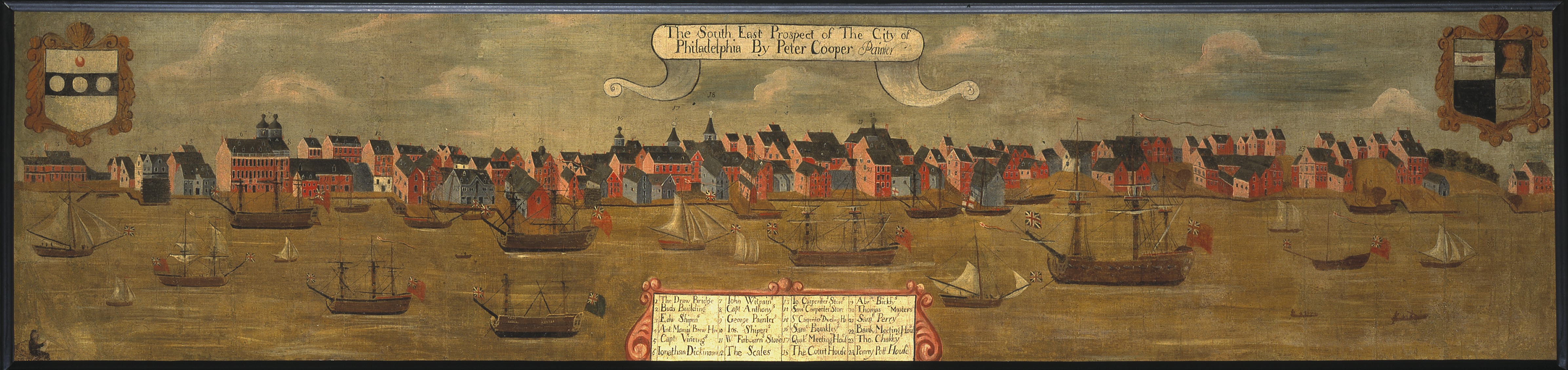 Peter Cooper Oil on canvas. The earliest painting of a North American city. This treasure came to The Library Company as a gift from George Mifflin Dallas in 1857, then American minister at the Court of St. James. "One of the members of Parliament in looking over the rubbish of a City curiosity shop" brought him a view of the southeast prospect of Philadelphia painted by Peter Cooper about 1720. He sent the "antique daub" back to its place of origin, deprecating its value except as a curiosity. The Cooper View, now restored and framed, is one of the most valuable of all Philadelphia paintings, the oldest surviving canvas of any American city. To learn more about this and other treasures of the Library Company visit: http://www.librarycompany.org.