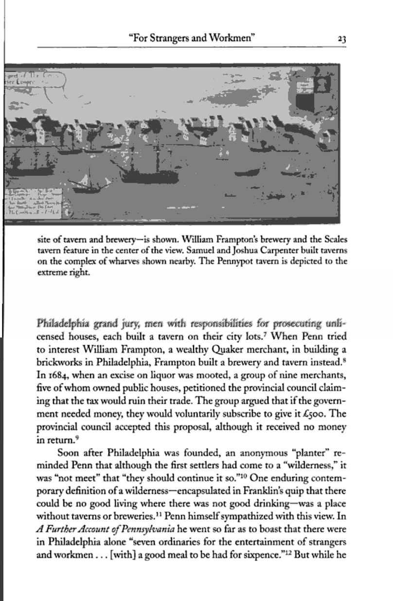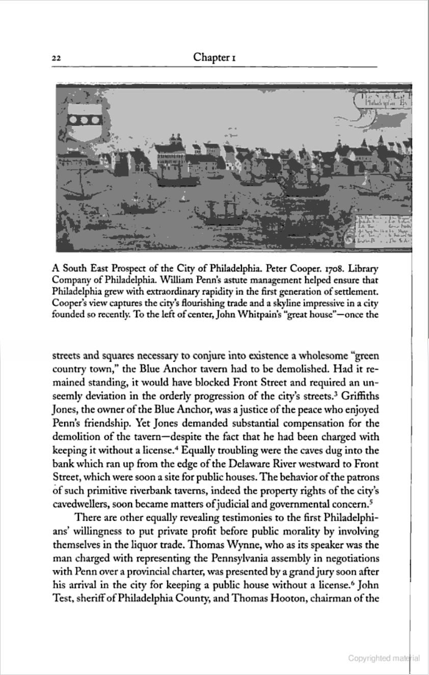 There are...revealing testimonies to the first Philadelphians' willingness to put private profit before public morality by involving themselves in the liquor trade. Thomas Wynne, who as its speaker was the man charged with representing the Pennsylvania assembly in negotiations with Penn over a provincial charter, was presented by a grand jury soon after his arrival in the city for keeping a public house without a license. John Test, sheriff of Philadelphia County, and Thomas Hooton, chairman of the Philadelphia grand jury, men with responsibilities for prosecuting unlicensed houses, each built a tavern on their city lots. (pp. 22-23)