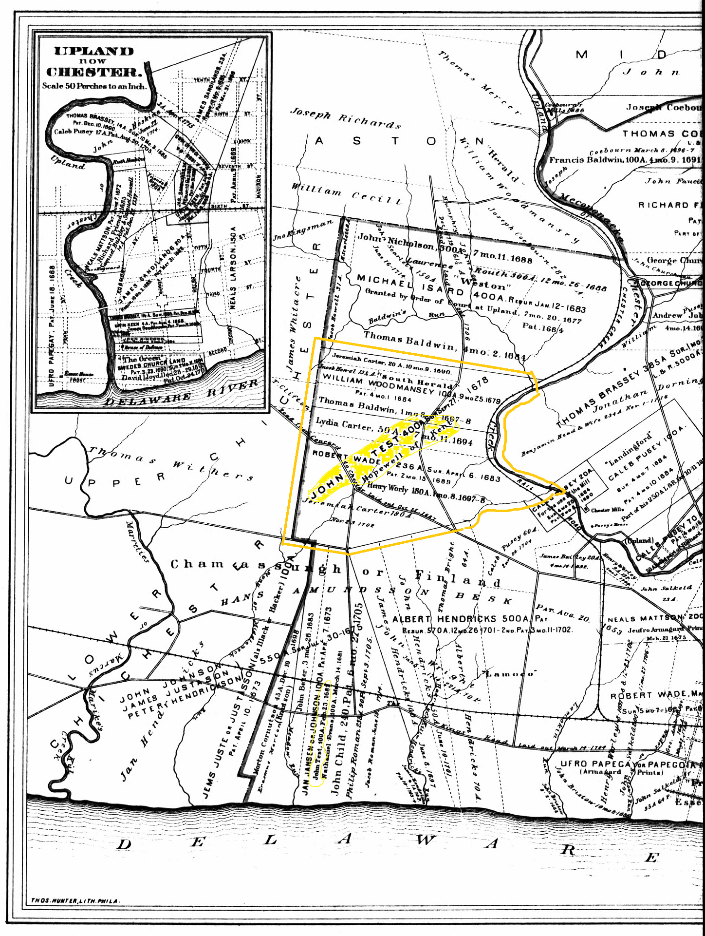 The map is from Benjamin H. Smith, Atlas of Delaware County Pennsylvania: Containing Nineteen Maps Exhibing the Early Grants and Patents Compiled from Official Records Together with A History of the Land Titles in the County ( Philadelphia: Press of Henry B. Ashmead, 1880), p. 38. Available at ancestry.com.