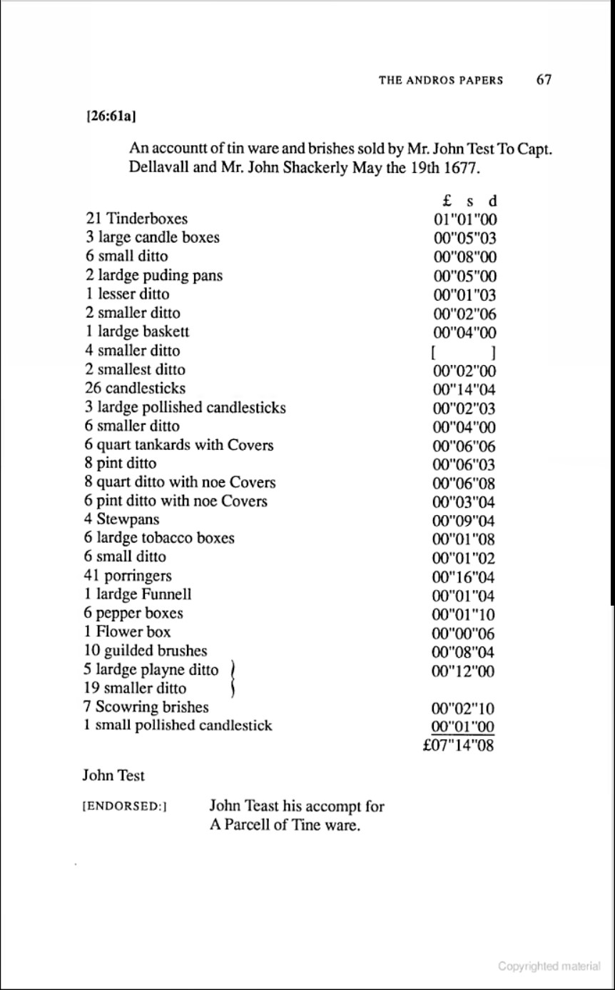 This is an account list of items John Test sold, it appears through two intermediaries, to Governor Edmund Andros of New York– governor of New York, New Jersey and the colony along the Delaware River.
